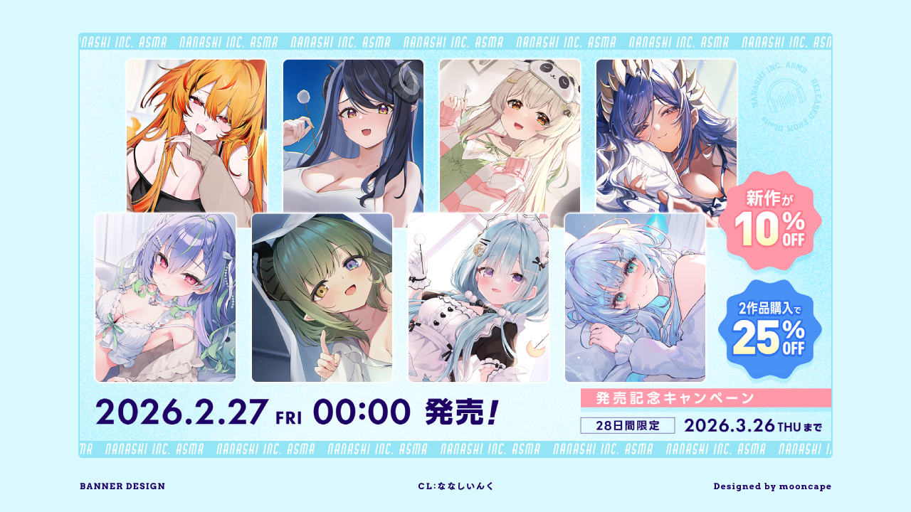 2026/02ななしいんく音声作品第4弾 ジャケット・宣伝画像GRAPHICTHUMBNAILASMRBannerVTuberななしいんくhttps://www.dlsite.com/home/campaign/bulkbuy/=/key/202602home774inc/ SHARE